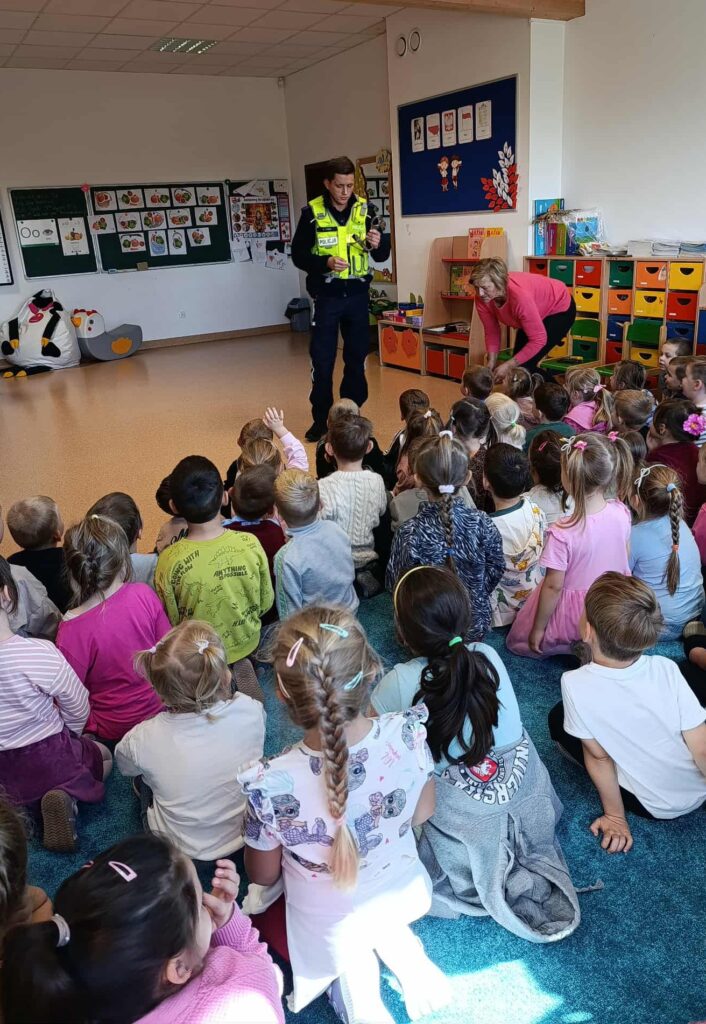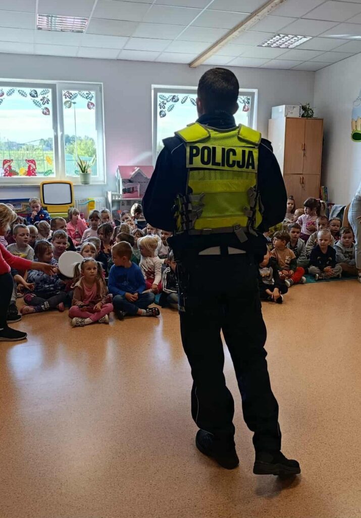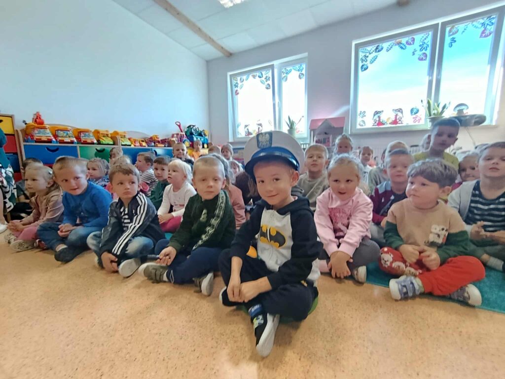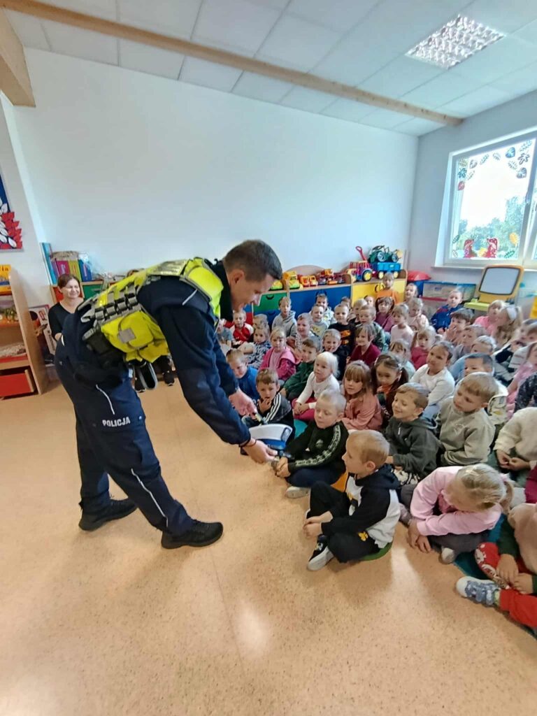 26 września 2025r. w naszym oddziale przedszkolnym odbyło się spotkanie z policjantem. Celem wizyty było przypomnienie naszym przedszkolakom numerów alarmowych, podstawowych zasad bezpieczeństwa podczas przechodzenia przez ulicę, konieczności posiadania elementów odblaskowych oraz jak należy się zachować, gdy na swojej drodze spotkają obcą osobę. Dzieci mogły zobaczyć jak wygląda mundur policjanta oraz jaki sprzęt jest mu potrzebny w trakcie służby.