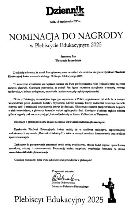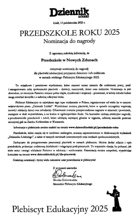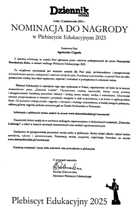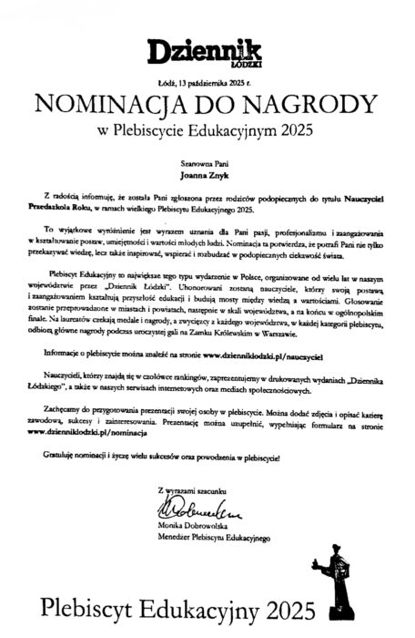 Z radością informujemy, że nasze Przedszkole, Pan Dyrektor Wojciech Szcześniak oraz nauczycielki Pani Joanna Znyk i Pani Agnieszka Ciąpała zostali nominowani w Plebiscycie Edukacyjnym Dziennika Łódzkiego 2025.