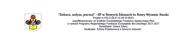 Celem projektu jest poprawa jakości kształcenia w Szkole Podstawowej im. Pierwszego Marszałka Polski Józefa Piłsudskiego w Nowych Zdunach (SP) dla której organem prowadzącym jest Gmina Zduny oraz zwiększenie szans edukacyjnych i rozwojowych 100 (50K i 50M) uczniów w SP w Nowych Zdunach w okresie 01.02.2026-30.06.2027 poprzez rozwój kompetencji kluczowych społecznych i emocjonalnych, cyfrowych w tym potrzeb uczniów ze specjalnymi potrzebami edukacyjnymi w tym z niepełnosprawnością